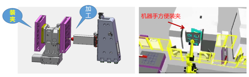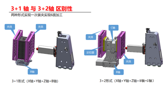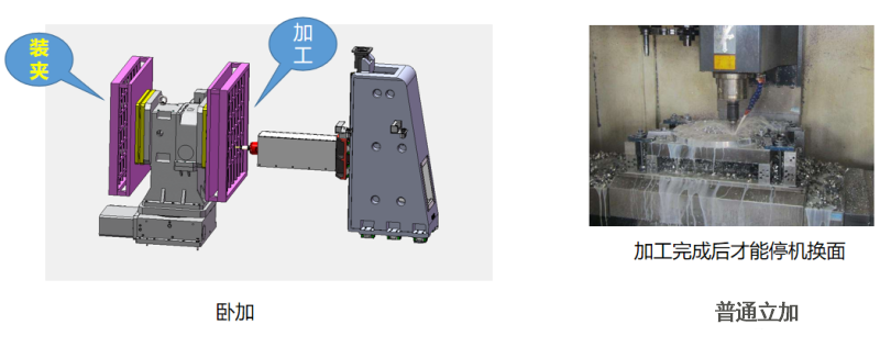 臥加3+1軸或3+2軸正面加工時(shí),另一面朝外,有利于機(jī)械手裝夾,更容易實(shí)現(xiàn)自動(dòng)化。