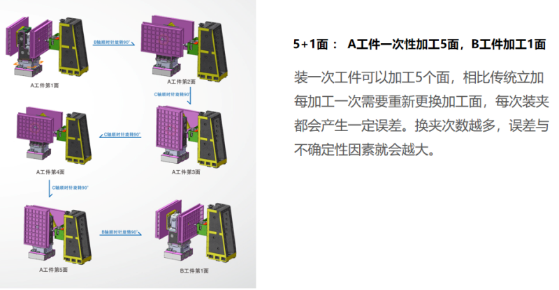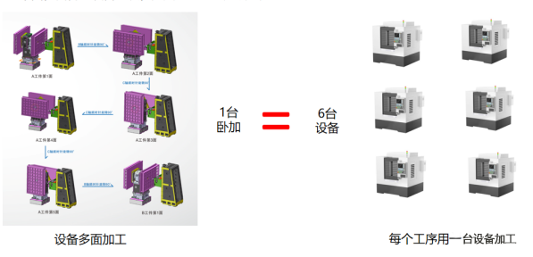 通過3+2軸或3+1軸實(shí)現(xiàn)設(shè)備六個(gè)面一次性加工完成,相當(dāng)于六臺(tái)立式加工中心,用不同程序分別依次加工一個(gè)面,我們的設(shè)備一次性完成了一條生產(chǎn)線的加工量。