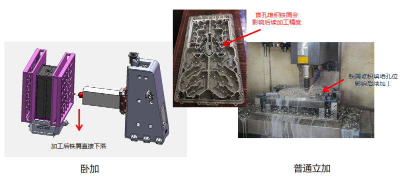 臥式解決長(zhǎng)久以來的機(jī)床排屑問題,例如:通訊業(yè)用立式加工鐵屑容易填堵盲孔,導(dǎo)致廢屑進(jìn)入孔內(nèi)出現(xiàn)加工誤差,造成品質(zhì)不良問題。