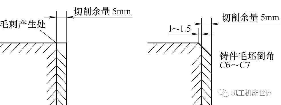 在設計產品零件時,可根據(jù)零件結構和使用特點,在毛坯面上增加倒角或圓角,可有效地避免或減少毛刺的產生。如圖1所示,在加工工件端面時,會在兩平面的交點處產生毛刺。為減少毛刺的產生,在零件設計時增加C1~C1.5的倒角,進而零件毛坯設計時增加C6~C7的倒角。這樣改進后在加工圖示位置時便幾乎不再產生毛刺。