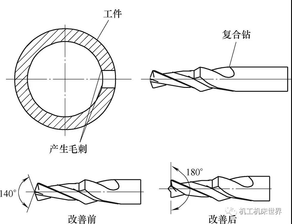 零件在機械加工時所使用的切削刀具不可避免地會產生毛刺,通過改善刀具可減少毛刺的產生。如圖2所示,在加工徑向孔時,成形鉆加工完成后容易產生長度為2~3mm、厚度為0.1~0.3mm的毛刺,使用普通的去毛刺工具很難把毛刺去除干凈,同時反復去毛刺又容易劃傷內孔表面,造成工件報廢。經(jīng)過反復試驗驗證,設計了鉆尖尾部為180°的成形鉆來加工圖示工件的徑向孔。改善后的刀具加工完成的工件,交叉孔處產生較小毛刺,用毛刷就能輕松去除,適用于大批量零件生產使用。
