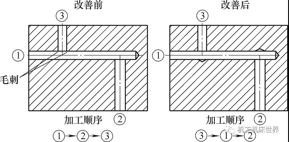 零件的加工工藝也是影響毛刺產生的很重要的因素,合理的加工工藝能減少毛刺的產生,例如一些交叉孔較多的閥體、閥塊等零件的加工,合理的孔加工順序能有效地減少毛刺的產生。如圖3所示,改善前的孔加工順序為①→②→③,在孔③加工完成后就容易在圖示位置產生毛刺,且較難去除,影響零件的質量。改善后的加工順序為③→①→②,先加工孔③,再加工孔①和孔②,就能有效地減少毛刺的產生。