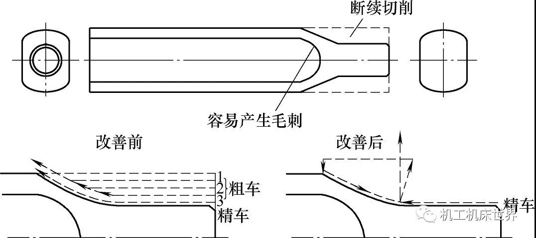 零件在切削加工過程中,合理的走刀方向能有效地控制毛刺的產生。如圖4所示,車削參數(shù)分別為:切削速度86~132m/min,進給量0.30~0.35mm/r,吃刀量0.8~2.0mm。由于車削工況為斷續(xù)車削,改善前的普通粗、精車削走刀方式容易在圖示位置產生長度為0.5~1.0mm的飛邊毛刺,需要專門增加去毛刺工序來去除毛刺。我們可以通過改變精車的走刀方式和精車余量來避免毛刺的產生,精車余量由改善前的0.8mm改為0.5mm,走刀路線如圖4所示。