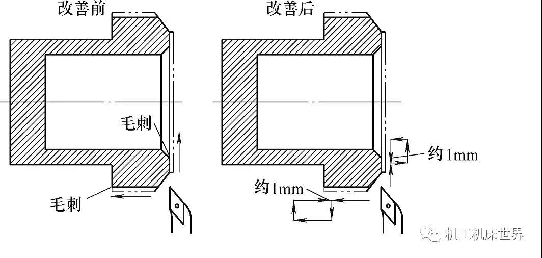 如圖5所示,車削參數(shù)分別為:主軸恒轉速,切削速度160m/min,進給量0.25mm/r,切削量0.5~2.0mm。改善前的走刀方式易造成在圖示位置產生毛刺,改善后更改蕞后1mm的切削方向,可避免產生毛刺,改善加工質量。