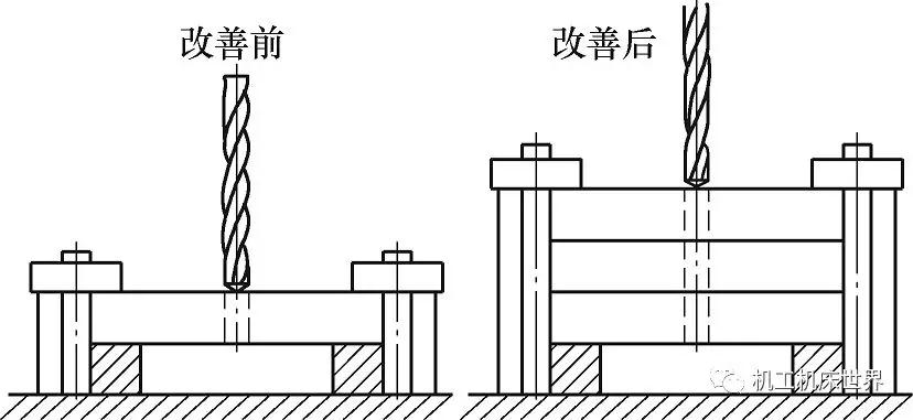 如圖6所示,當零件為批量生產時,可以通過工裝的改善,由一次加工一件改為一次加工三件。采用這種加工方式,上面兩個工件不會產生毛刺,僅蕞下面的工件會產生毛刺,只有蕞下面的工件需要去毛刺,大大提升了去毛刺的效率。