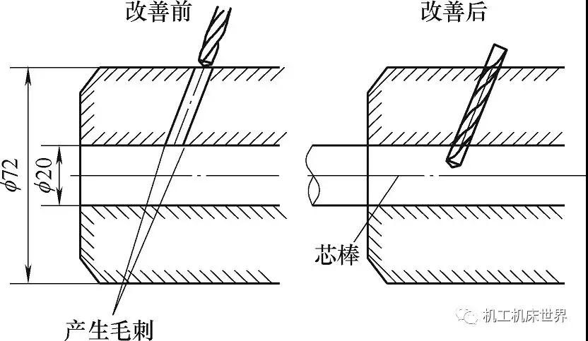 對于一些零星加工的單件,如圖7所示,在工件出口位置一定會出現(xiàn)毛刺,而且不容易去除。在加工圖示徑向斜孔時,增加輔助固定芯棒,加工完成后撤去輔助芯棒。由于輔助芯棒的存在而避免了在圖示位置產生毛刺,避免了毛刺存留、內孔壁劃傷的風險,保證了零件的加工質量。